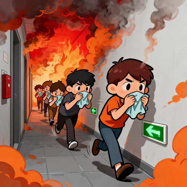 2. 快速逃生:選擇最近的安全出口,切勿乘坐電梯,用濕毛巾捂住口鼻,低姿勢(shì)前進(jìn)。