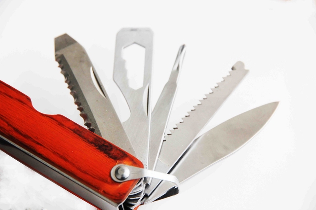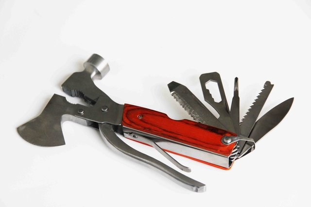 【主要工具】1.鉗子;2.十字螺絲刀;3.雙面戳刀;4.木鋸刀;5.小刀;6.開(kāi)瓶器;7.一字改錐;8.拔木塞器;9.鋼絲剪;10.斧子;11.錘子及防身等多種功能